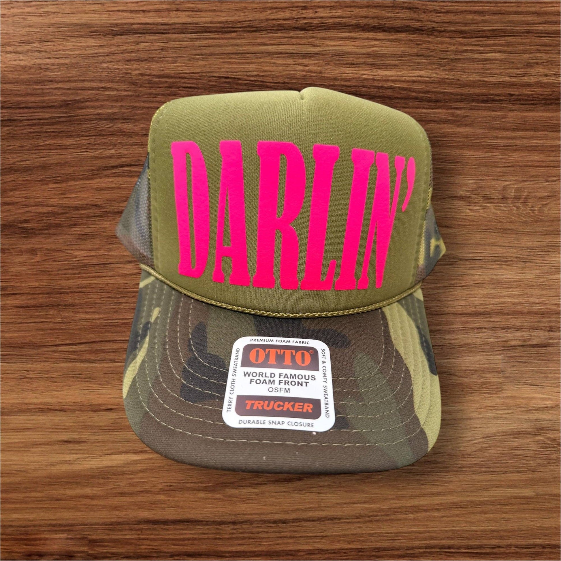 DARLIN PINK PUFF on Camo and Olive Foam Trucker Hat