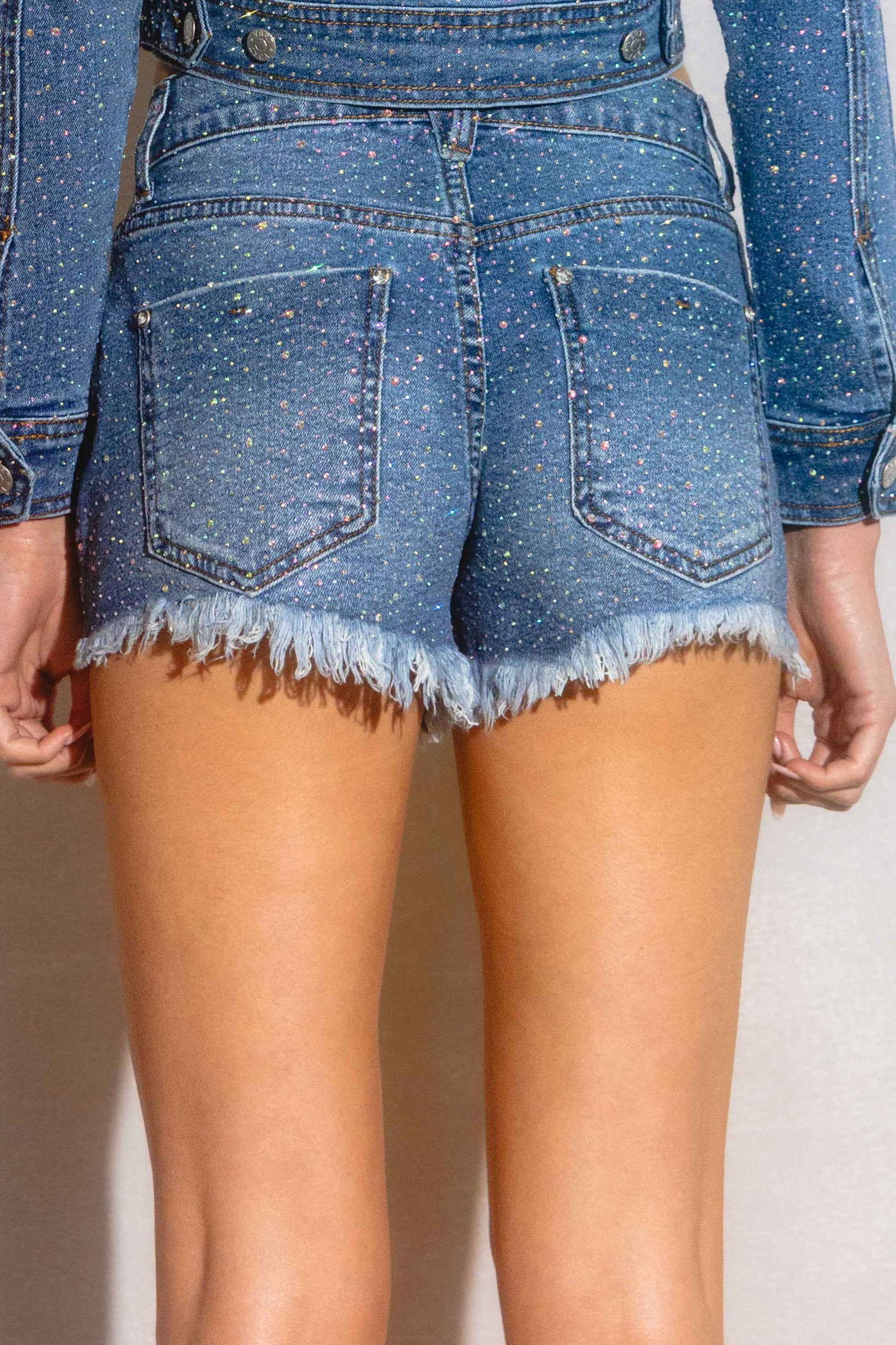 A pair of mid rise denim shorts featuring all over rhinestone, raw edge distressed leg opening hem, classic 5-pocket construction and zip-fly closure.