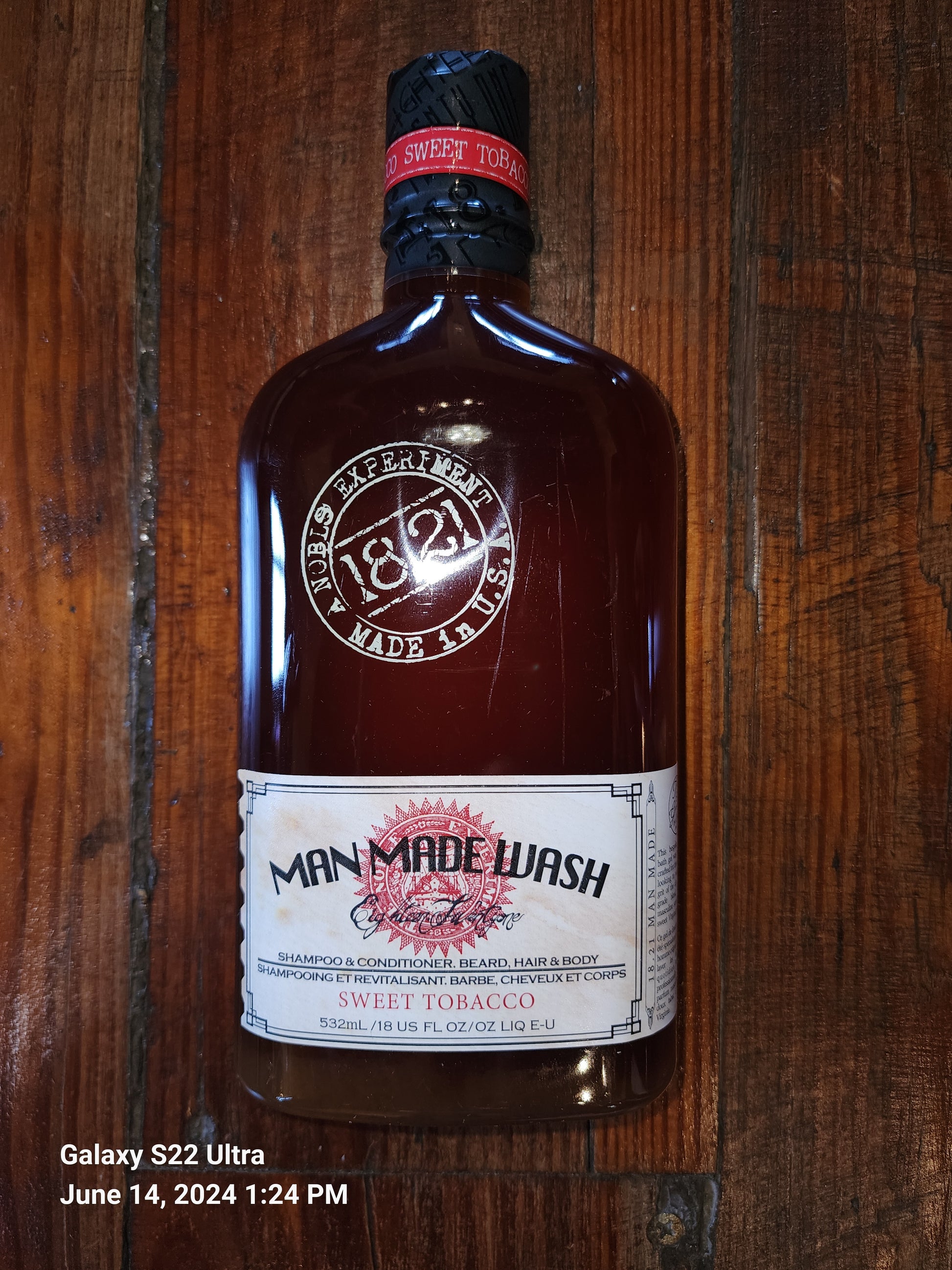 Man made wash sweet tobacco. Shampoo, conditioner, beard, hair, and body. 18fl ozs
