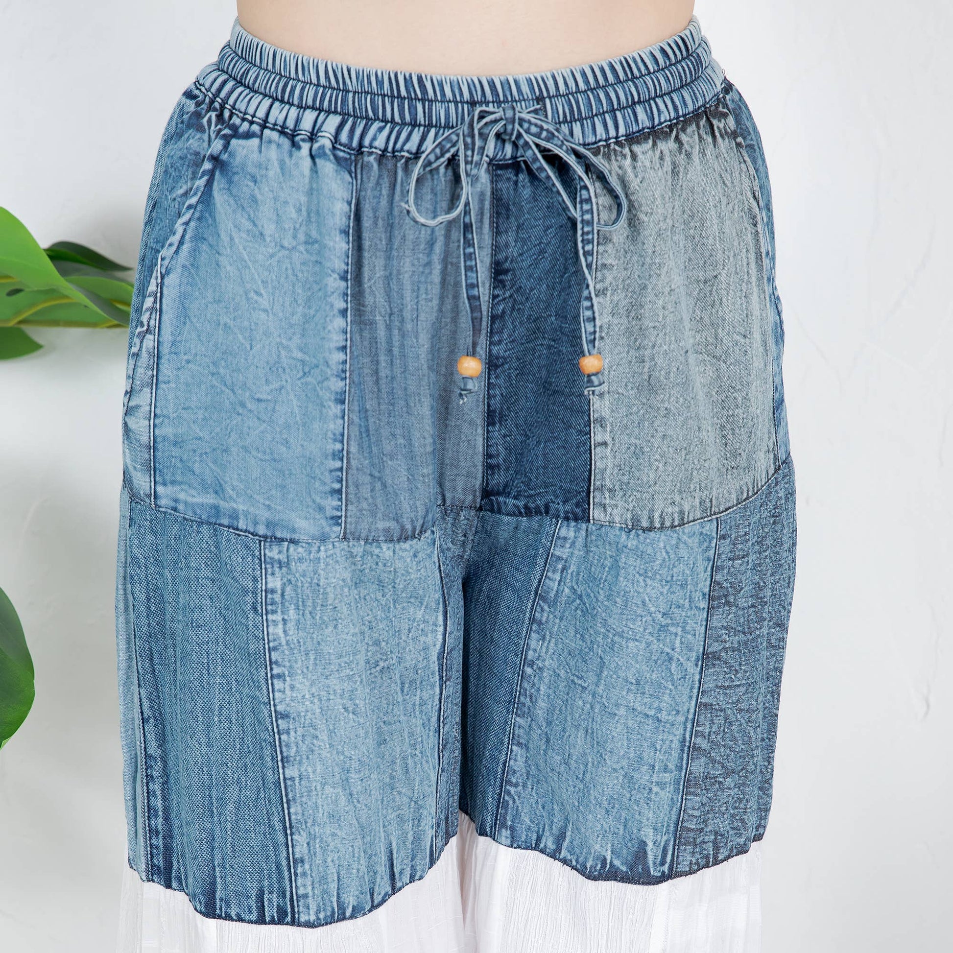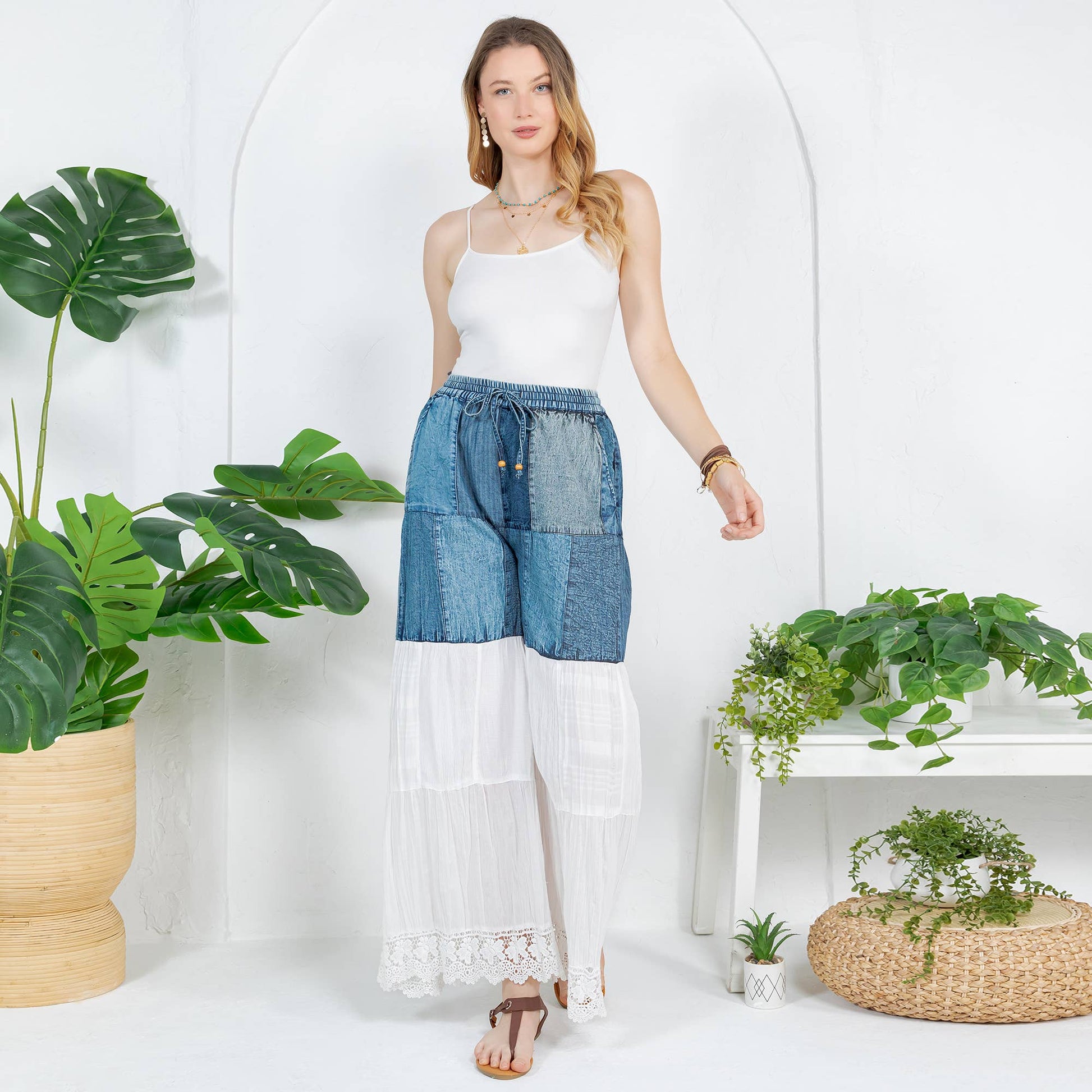 • Style: Long pant in rayon with denim patch and jacquard rayon lace detailing, blending boho and Western influences for a stylish, summer-ready look