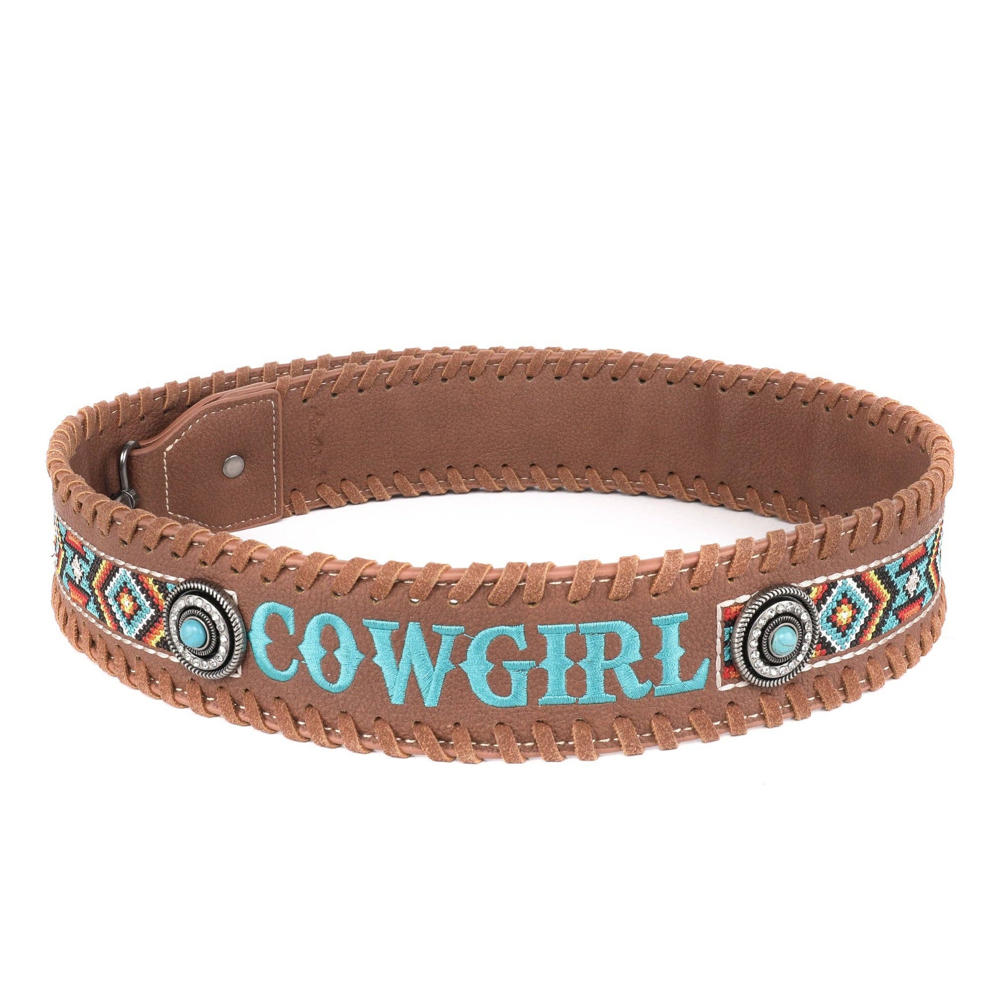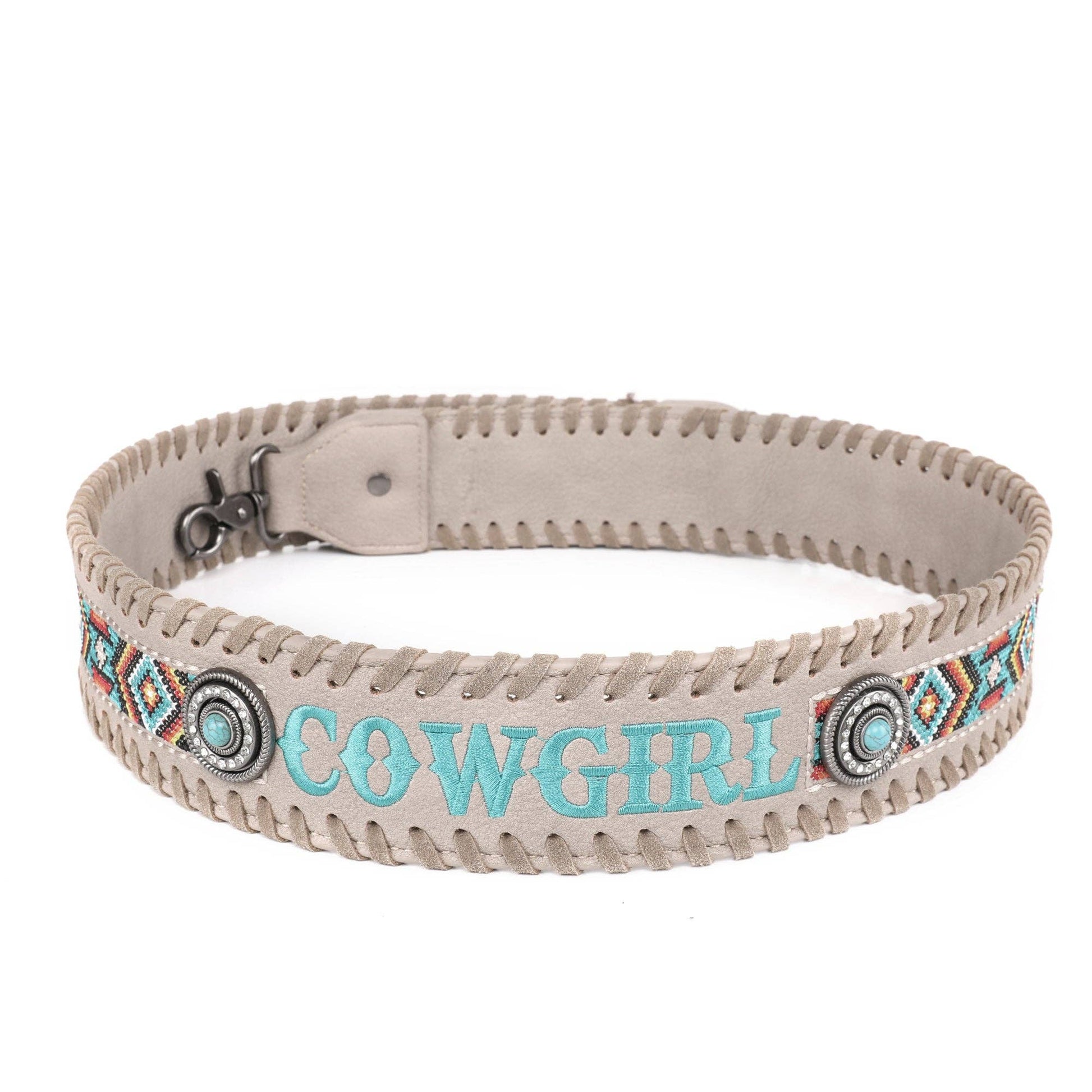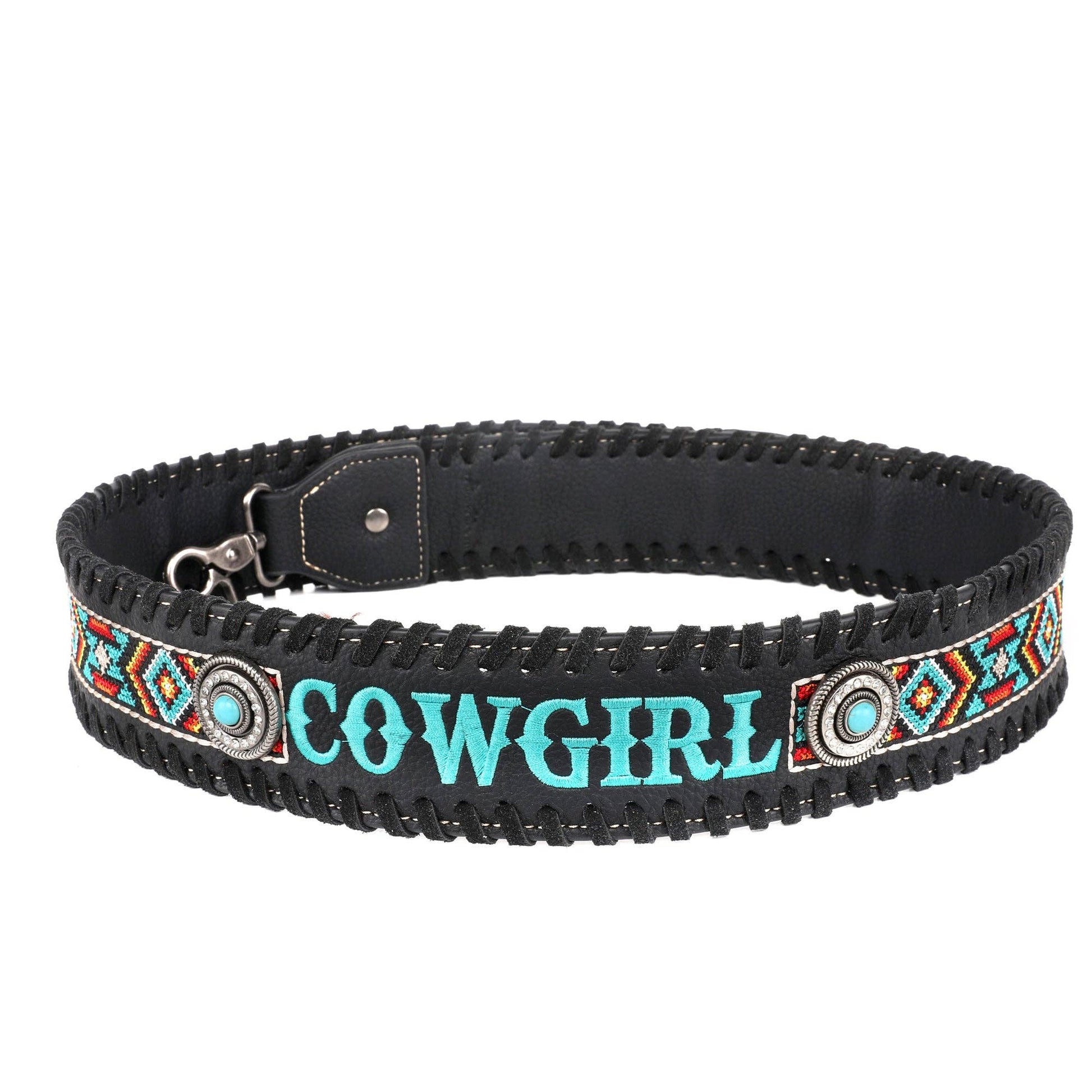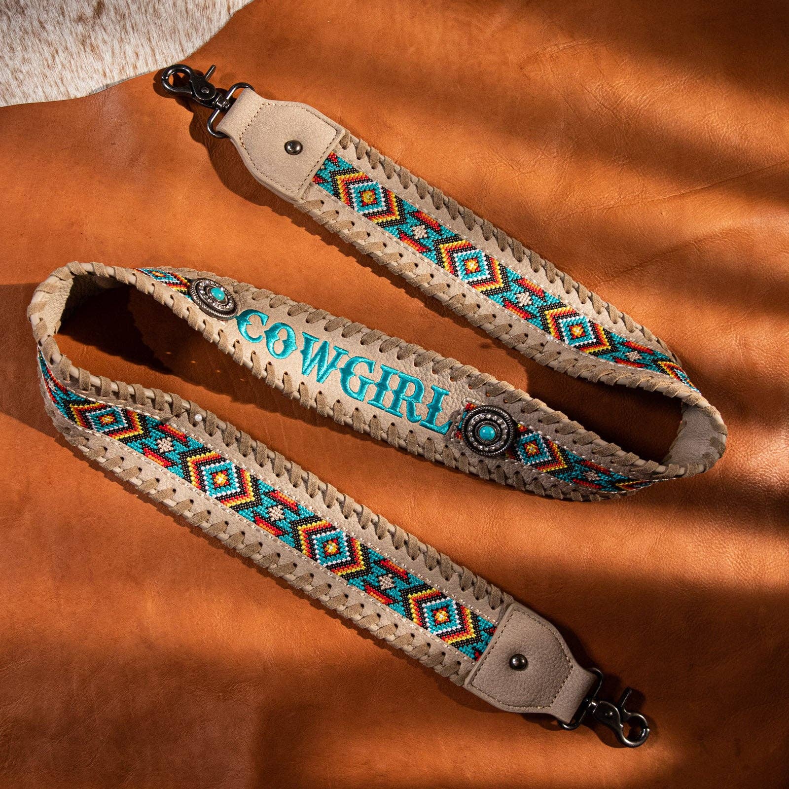 * Embroidered Aztec pattern and "COWGIRL" on the strap