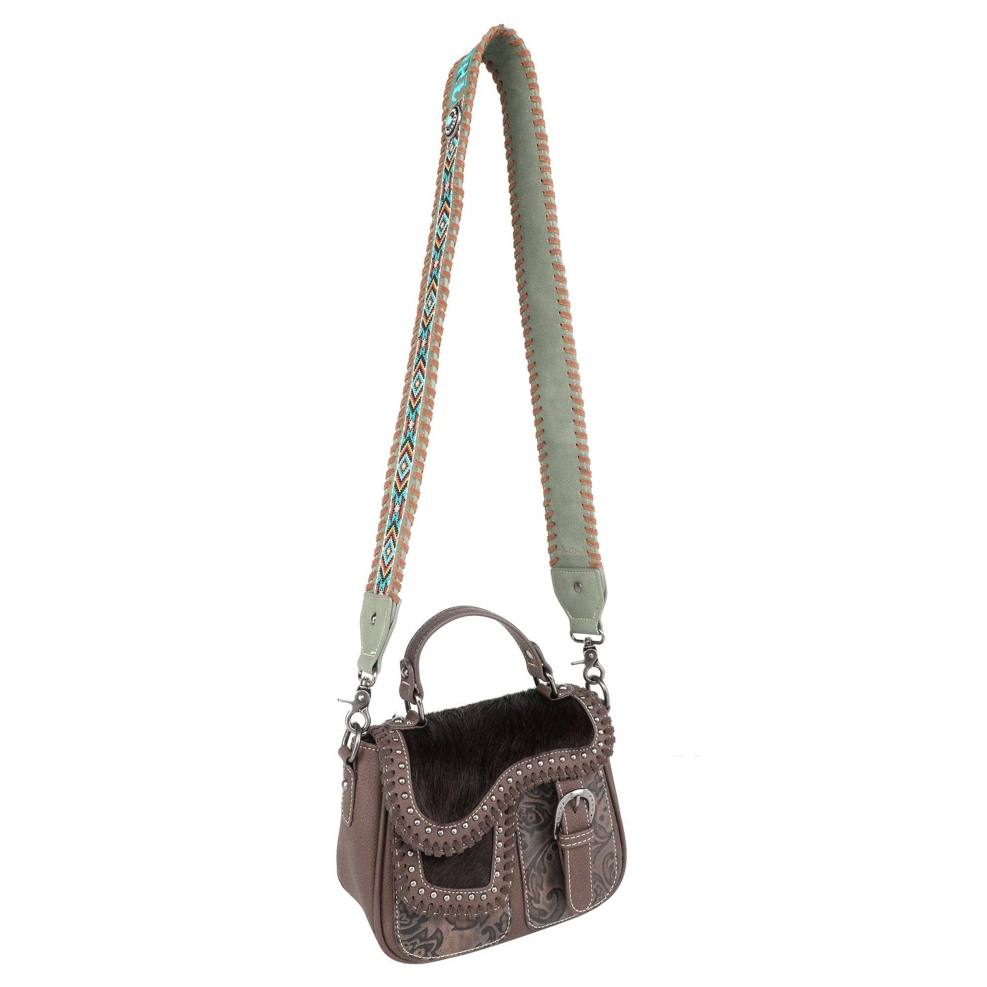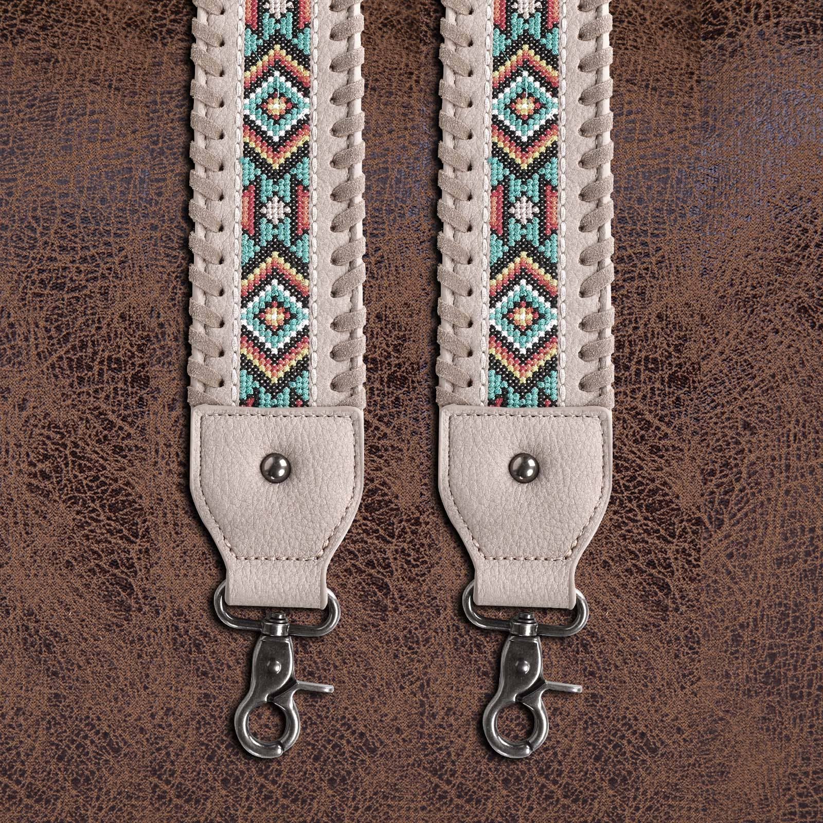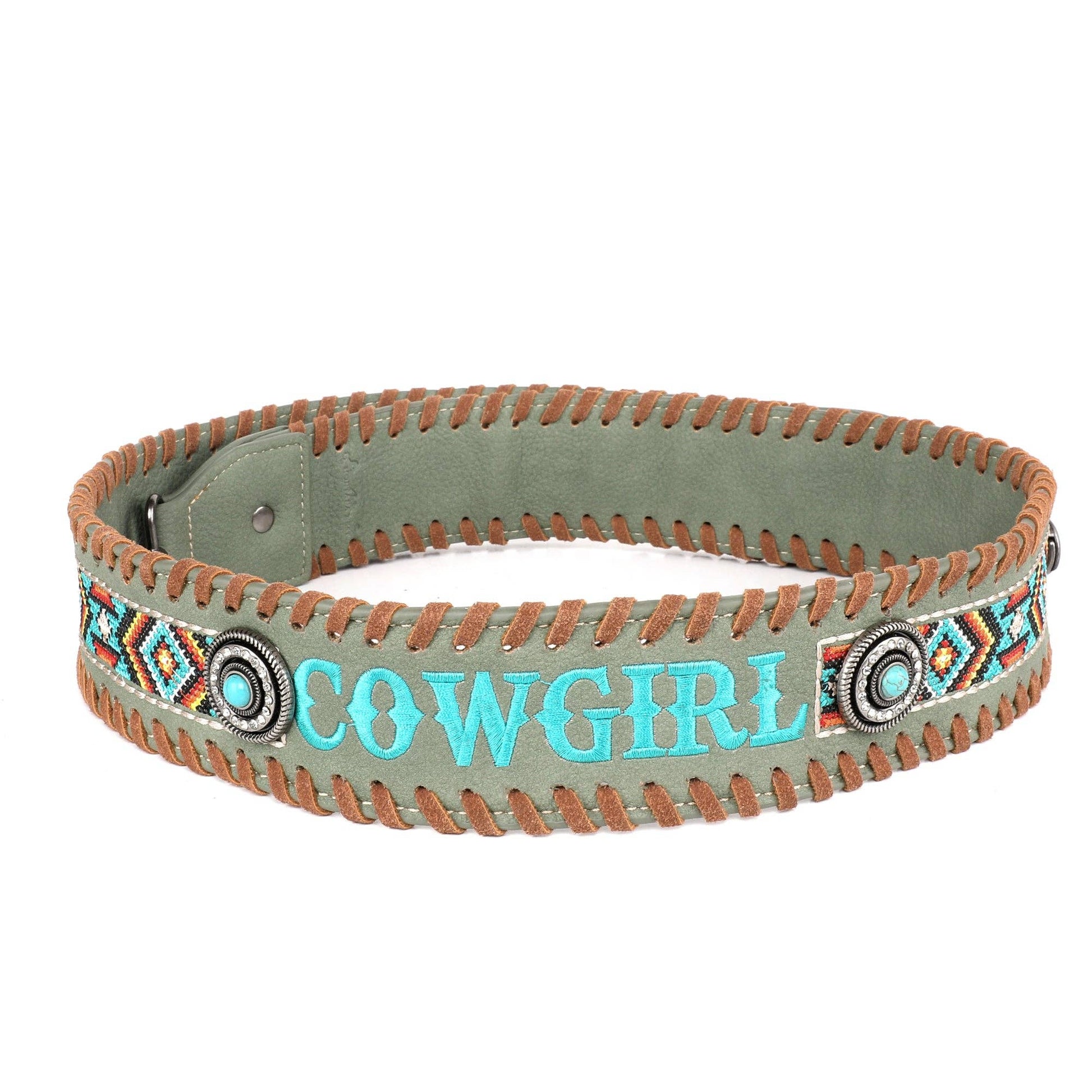 * Embroidered Aztec pattern and "COWGIRL" on the strap