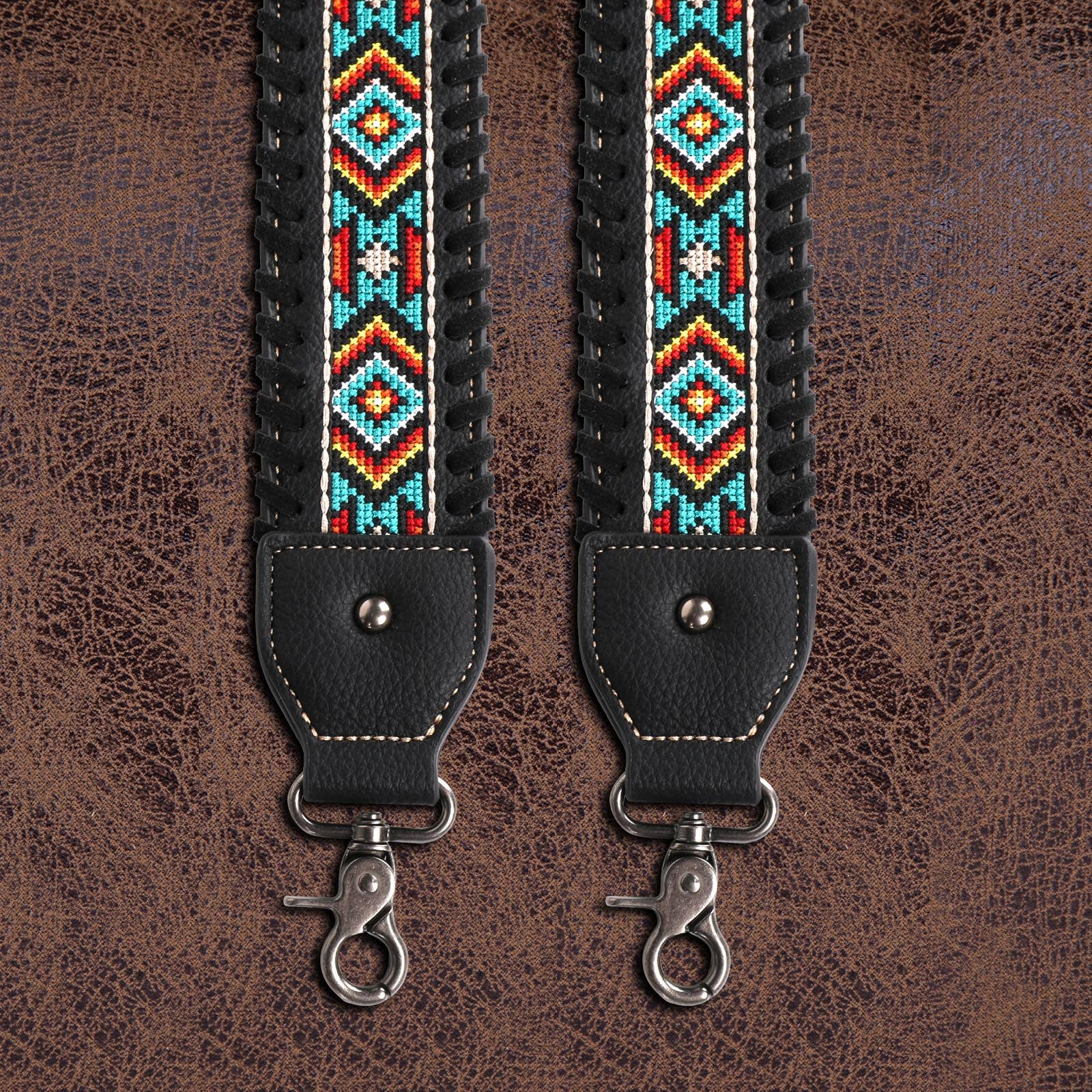 Made of PU leather, this western guitar style crossbody strap has:-